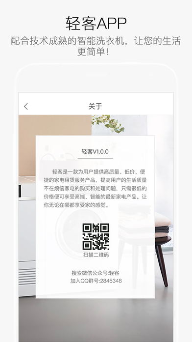 輕客洗衣是一款智能洗衣應(yīng)用,輕客團隊致力于向廣大學(xué)生、白領(lǐng)、藍(lán)領(lǐng)等群體提供健康、實惠的優(yōu)質(zhì)洗衣服務(wù),通過手機APP控制智能洗衣機的方式,為用戶帶來全新的智能洗衣體驗。