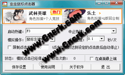 蟲蟲鼠標(biāo)自動點擊器 V2.0 簡體中文綠色免費版 本軟件目前有一個獨特的功能,就是可以用鼠標(biāo)直接用啟動和中止熱鍵,如:你用“鼠標(biāo)左鍵按下”做啟動熱鍵,用“鼠標(biāo)左鍵抬起”做中止熱鍵,那么,你只要按下鼠標(biāo)左鍵不抬起來,本程序就可以一直模擬鼠標(biāo)點擊。