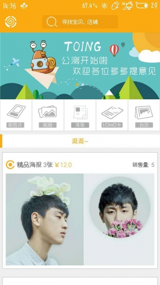 Toing讓你成為優(yōu)秀影像設(shè)計(jì)師:瀏覽“印制”,從Toing精心挑選的印制產(chǎn)品選擇你所中意的一款進(jìn)行自主創(chuàng)作;在“發(fā)現(xiàn)”分享美好生活,進(jìn)行社交活動。