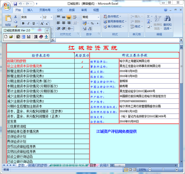 江城資產(chǎn)評估網(wǎng)推出的江城驗資系統(tǒng)是由審計人員熟悉的Excel和Word編制而成。操作簡單,快速的生成驗資報告是本系統(tǒng)的特色,系統(tǒng)自動的將Excel錄入的數(shù)據(jù)快速的鏈接之驗資報告中,省去了審計人員核對的麻煩。并且系統(tǒng)提供了比較全面的底稿常用表格。為驗資報告歸檔提供便利。最令人驚喜的是本程序完全免費的。【軟件特點】