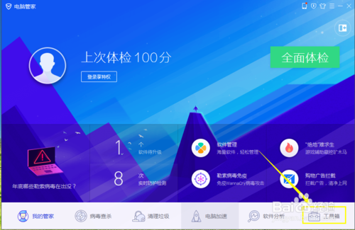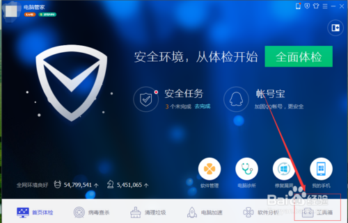 打開騰訊電腦管家,點(diǎn)擊頁面右下角的“工具箱”