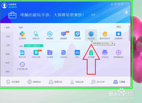 在"電腦管家 (窗格)"上,左鍵單擊:"測試網(wǎng)速(圖標(biāo)按鈕)",(在"電腦管家"中)。