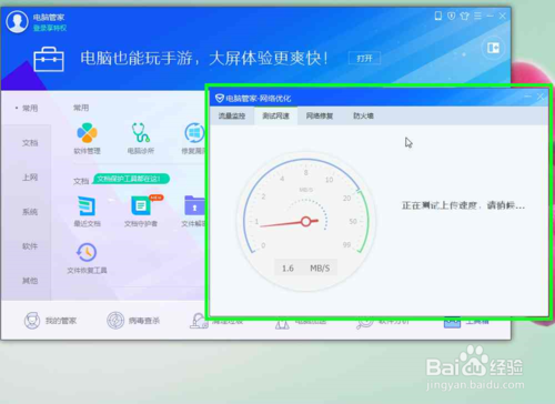 在"電腦管家-網(wǎng)絡(luò)優(yōu)化 (窗格)"上,正在測試上傳速度,請稍后......(在"電腦管家-網(wǎng)絡(luò)優(yōu)化"中)。