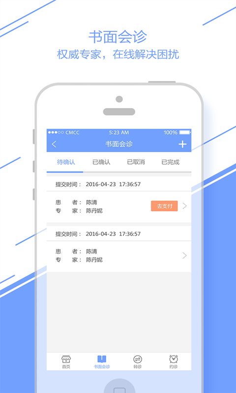 名醫(yī)會(huì)診是專業(yè)的書(shū)面會(huì)診、雙向轉(zhuǎn)診移動(dòng)服務(wù),匯聚了三甲名醫(yī)專家資源,為各級(jí)醫(yī)院和醫(yī)生提供便捷、無(wú)疆界的分級(jí)診療服務(wù),緩解患者看病難的痛點(diǎn)。書(shū)面會(huì)診:初診醫(yī)生選擇專家,填寫(xiě)并拍照上傳患者的初診資料。專家在接到初診資料后,可通過(guò)圖文/語(yǔ)音/視頻與初診醫(yī)生進(jìn)行病情溝通,并在約定的時(shí)間內(nèi)出具書(shū)面會(huì)診意見(jiàn),供初診醫(yī)生和患者參考。