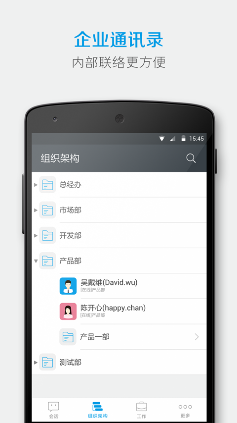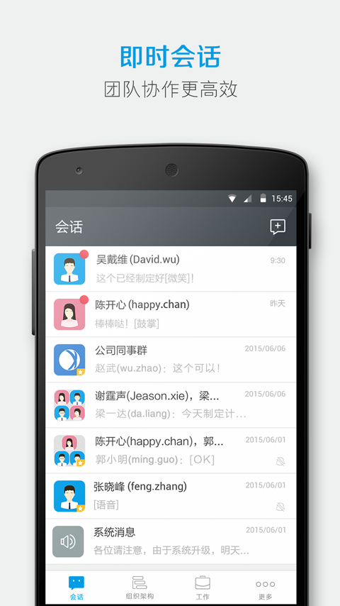 1、企業(yè)通訊錄,內(nèi)部聯(lián)絡(luò)更方便。2、即時(shí)會(huì)話,團(tuán)隊(duì)協(xié)作更高效。