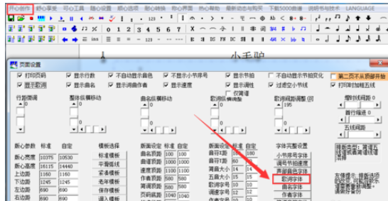 首先是確定歌詞字體字號(hào)。單擊開(kāi)心創(chuàng)作---頁(yè)面設(shè)置。單擊歌詞字體選項(xiàng)。