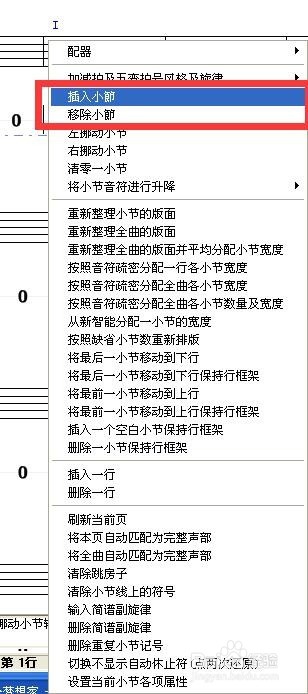 鼠標(biāo)移到需要?jiǎng)h除或者插入小節(jié)的小節(jié)線上,點(diǎn)擊鼠標(biāo)右鍵,選擇插入小節(jié)或者移除小節(jié)
