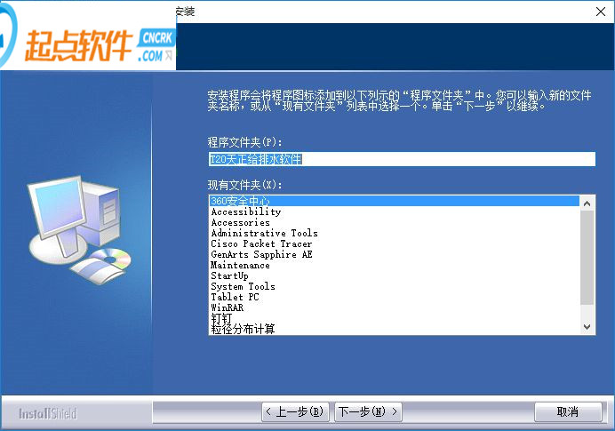 4、可以對(duì)程序文件夾進(jìn)行快速的選擇,默認(rèn)文件夾“T20天正給排水軟件”,點(diǎn)擊下一步;