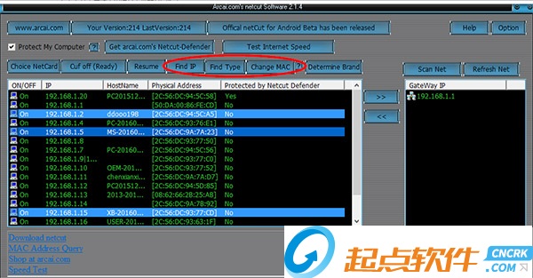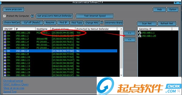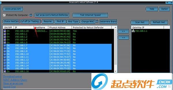 2、利用ARP協(xié)議,網(wǎng)絡(luò)剪刀手(NetCut 2.14)可以切斷局域網(wǎng)里任何主機(jī)和網(wǎng)關(guān)之間的連接,使其斷開與Internet的連接,同時也可以看到局域網(wǎng)內(nèi)所有主機(jī)的IP地址和MAC地址