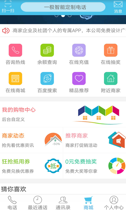 一極智能定制電話,由蘭州一極網(wǎng)絡(luò)科技有限公司于2015年8月自主研發(fā)推出,截止2016年10月底,用戶已經(jīng)突破2000000人。一極智能定制電話,電話通訊功能落地,滿足普通大眾自用撥打電話省錢。定制營(yíng)銷功能拓展:通過(guò)后臺(tái)管理賬號(hào),管理者可將軟件打造成完全專屬于商家企業(yè)和社團(tuán)個(gè)人的私人定制軟件。