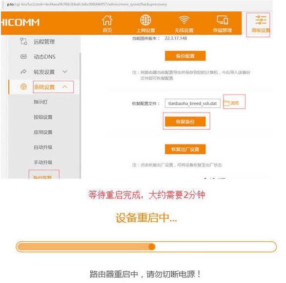 3、進入:高級設(shè)置->系統(tǒng)設(shè)置->備份恢復->瀏覽->選擇下載的tianbaoha_breed_ssh.dat->點擊恢復備份等待進度條完成(大約需要2分鐘)。