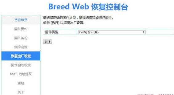4、恢復固件之前最好在Breed Web恢復控制臺恢復一下出廠設(shè)置,固件類型:Config區(qū)(公版),如下圖。