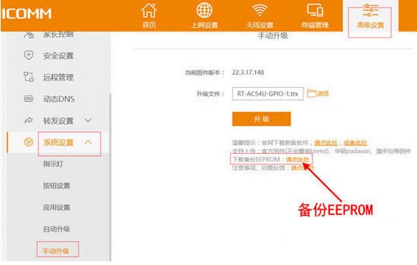 5、進入高級設(shè)置->系統(tǒng)設(shè)置->手動升級->點擊此處備份EEPROM。