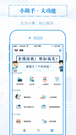 車主服務(wù):交通查違章、代交罰款、一鍵挪車、專車服務(wù);學(xué)生服務(wù):名師在線課堂、全國高考查詢、人才招聘;健康服務(wù):廣東省各地知名醫(yī)院在線掛號(hào);