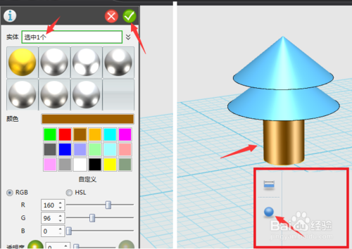 在左側(cè)工具欄中,先找到“材質(zhì)渲染”按鈕這個圓球形圖標(biāo),單擊鼠標(biāo)左鍵打開窗口。在窗口中選擇一種顏色,這里樹干選擇棕色,點擊右上角對號確定,如下圖所示。