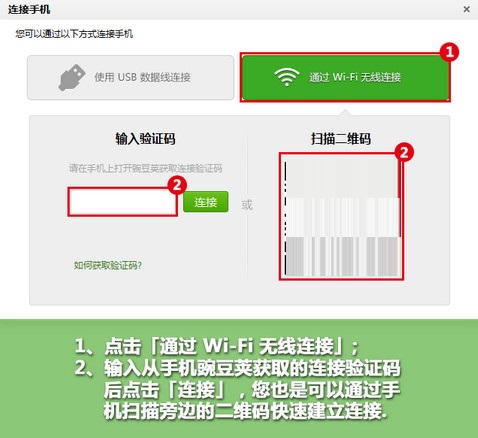 STEP 3:在桌面端輸入手機(jī)的驗(yàn)證碼,如果連接順利你的手機(jī)便與豌豆莢建立了Wi-Fi連接;