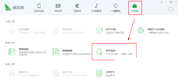1、首先打開豌豆莢,然后在它的“工具箱”中打開“鈴聲制作”功能,如下圖所示: