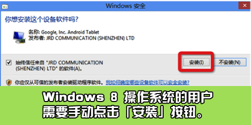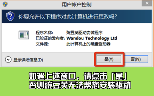 STEP2:重啟豌豆莢,豌豆莢會(huì)重新安裝驅(qū)動(dòng),請(qǐng)您按照豌豆莢的提示進(jìn)行操作,如果彈出「用戶賬戶控制」界面,請(qǐng)您選擇「是」。并在接下來彈出的窗口中點(diǎn)擊「安裝」按鈕;如果您點(diǎn)了「否」,豌豆莢將無法正確安裝您手機(jī)的驅(qū)動(dòng),您需要回到 STEP 1 重新操作;