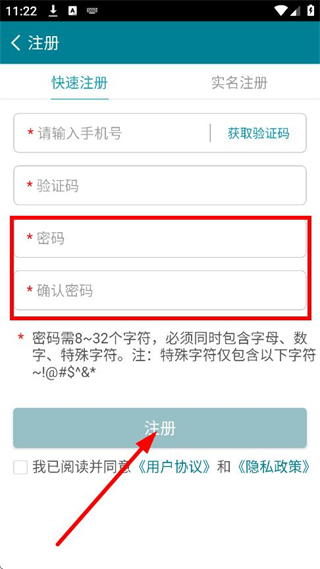 5、設(shè)置密碼并確認(rèn)后,勾選同意,接著點(diǎn)擊注冊(cè),即可完成賬號(hào)注冊(cè)操作。