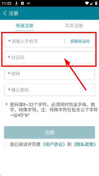 4、于快速注冊(cè)頁面處,填入手機(jī)號(hào),接著點(diǎn)擊獲取驗(yàn)證碼并完成輸入。