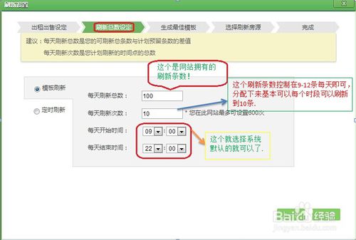 選擇模版刷新,設(shè)置好每天刷新總數(shù)(這個(gè)是有網(wǎng)站決定的)和每天刷新次數(shù)(這個(gè)由自己自由設(shè)置),每天開始已經(jīng)結(jié)束時(shí)間(最好選擇系統(tǒng)默認(rèn),也可以自由設(shè)置),點(diǎn)擊下一步.