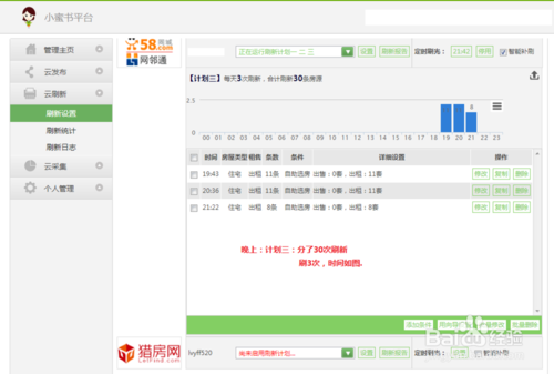 3、房產(chǎn)小蜜書的云刷新功能是我的最愛,因?yàn)樗梢栽O(shè)置個(gè)性化的刷新方案。并且同時(shí)啟用多套刷新計(jì)劃,保證了我的房源能夠及時(shí)刷新,而且刷新速度非???,設(shè)置起來(lái)很靈活;