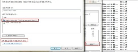 點(diǎn)擊“高級(jí)”按鈕,出現(xiàn)“所有者”窗口,在將所有者選擇Administrators,選擇“替換子容器和對(duì)象的所有者“后確定。
