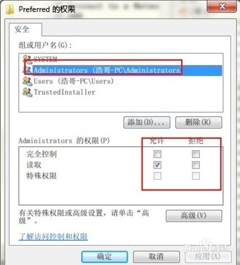 回到權(quán)限窗口,選擇“安全”,在Administrators的權(quán)限選擇完全控制并允許,這樣注冊(cè)表的Preferred項(xiàng)進(jìn)行修改。