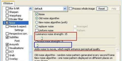 我目前是利用這兩個(gè)濾鏡來(lái)壓制一些早期的低碼率的avi(mpge4)asf格式的媒體,增加噪音后可以在一定程度上掩飾馬賽克,一般將亮度噪音控制在6-15左右,將色彩噪音取消即可,調(diào)到0