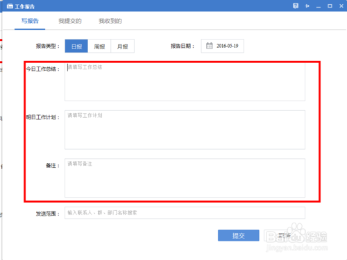 5、最后在發(fā)送范圍內(nèi)輸入發(fā)送對(duì)象,可以是人、群或者部門(mén),點(diǎn)擊提交就完成了