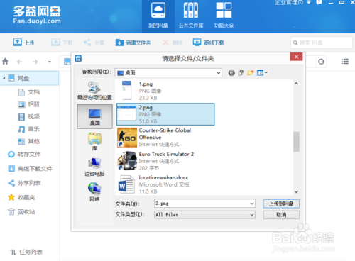 3、點(diǎn)擊上傳,在文件夾路徑中的選取你要上傳的文件,然后點(diǎn)擊上傳到網(wǎng)盤(pán)。