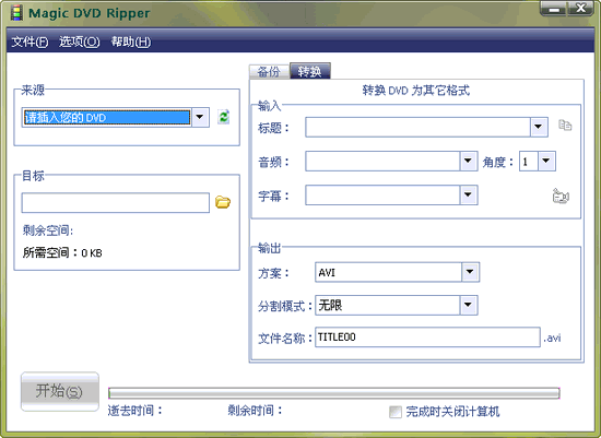 Magic DVD Ripper V5.3.0 漢化綠色特別版 Magic DVD Ripper 是一款DVD 電影抓取工具,支持 DVD to VCD,DVD to SVCD 轉(zhuǎn)換,抓取后的DVD已經(jīng)去除了區(qū)位碼保護(hù)和MacroVision 保護(hù),支持抓取或者轉(zhuǎn)換完成后自動(dòng)關(guān)機(jī)的功能,完整的支持市面上各種流行的DVD和VCD刻錄機(jī)和盤(pán)片!