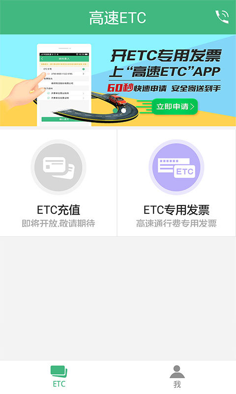 高速ETC app是山東高速官方指定ETC移動(dòng)充值圈存平臺(tái)。高速ETC app專用發(fā)票手機(jī)線上申請(qǐng),方便快捷,讓大家可享受魯通卡、信聯(lián)卡網(wǎng)上營業(yè)廳ETC專用發(fā)票60秒快速申請(qǐng),安全寄送到手,省時(shí)省力省心的服務(wù)。【更新日志】