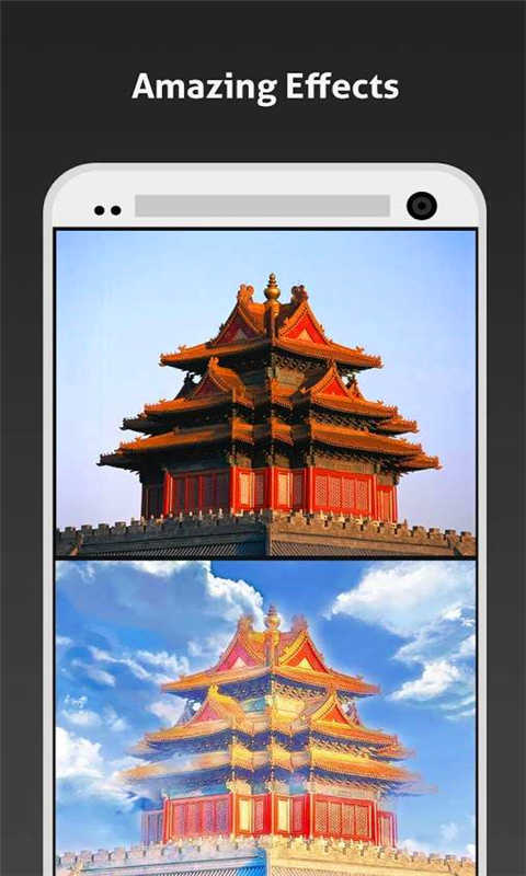 意境照片編輯器手機(jī)版是一款照片編輯器整照片的顏色,旋轉(zhuǎn)、裁剪、調(diào)整大小、添加效果、相框,并可在照片上涂鴉. 顏色調(diào)整選項(xiàng)包括色相、飽和度、對比度、和亮度. 此外, 您的照片提供了各種各樣的效果, 包括伽瑪校正, 自動對比度, 自動色階, 模糊, 銳化, 油性涂料, 素描, 黑 & 白高對比度, 深棕, 還會有更多.