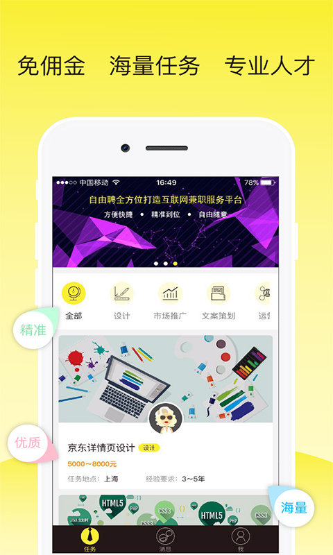 自由聘app是一款專注短期項目的求職招聘軟件,創(chuàng)業(yè)者可以隨時隨地在線發(fā)布信息,快速找到合適人才,自由職業(yè)者可以實時在線溝通交流,讓求職更高效。【軟件特點】