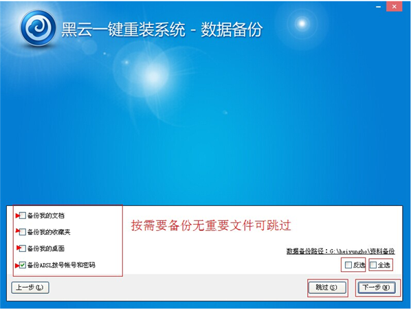 在這里根據(jù)自身情況選擇備份,提供桌面文件,收藏夾,我的文檔,寬帶帳號(hào)密碼 四個(gè)備份選項(xiàng) 在此聲明重裝系統(tǒng)只刪除系統(tǒng)盤(pán)(C盤(pán))數(shù)據(jù),其他盤(pán)文件不影響。