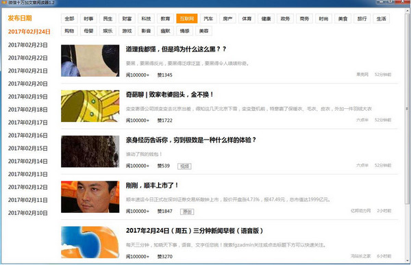 微信十萬加文章閱讀器是一款最新的微信公眾號熱門文章公布程序,為廣大用戶提供當前國內(nèi)最熱門各類微信公眾號爆文,第一時間了解受最歡迎的熱點,同時幫助廣大用戶更好的進行微信公眾號運營,協(xié)助大家快速做到微信閱讀量10W+,軟件下載使用完全免費,想知道如何做到微信文章十萬加,此好用的微信文章閱讀工具絕對是你做公眾號的必備神器。
