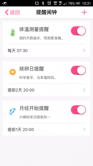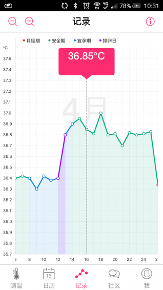 1、實(shí)時(shí)顯示測(cè)量出的體溫?cái)?shù)值。2、自動(dòng)繪制基礎(chǔ)體溫曲線(xiàn)圖并標(biāo)注排卵日、經(jīng)期等。