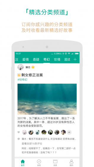 【個性化閱讀】愛情懸疑婚姻靈異古風世情傳奇等分類頻道,“深夜奇譚”“愛物語”“輕奇幻”等個性標簽——看你喜歡的故事。