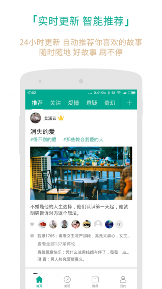 【智能推薦,實時更新】自動識別你的興趣,24小時滾動更新好故事——每一刻都精彩。