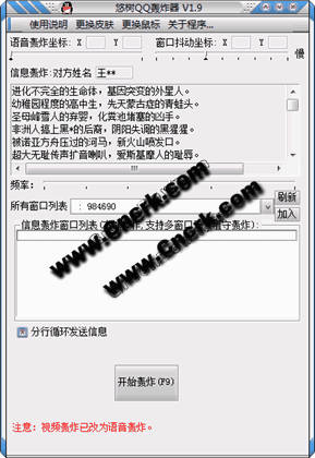 QQ轟炸機是一款QQ惡搞工具,該軟件提供多窗口無人值守信息轟炸,視頻轟炸,窗口抖動攻擊,你可以自由選擇轟炸頻率,配合 變速精靈 使用,效果更“佳”。