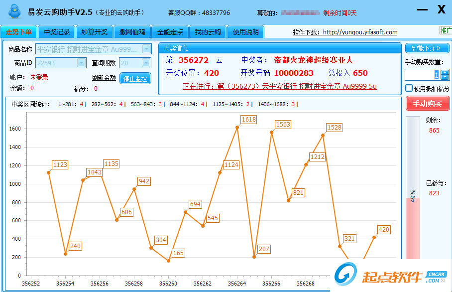 易發(fā)云購助手是一款一元云購助手輔助軟件,該軟件可查詢歷史期數(shù)走勢,并可快人一步提前開獎得知中獎信息,另軟件可提供手動和自動精準(zhǔn)卡位下單,提高中獎率,是一款不可多得的輔助軟件。打開易發(fā)云購助手exe,根據(jù)向?qū)瓿砂惭b,打開易發(fā)云購助手,關(guān)注你要一元秒搶的網(wǎng)站,點擊開啟即可,