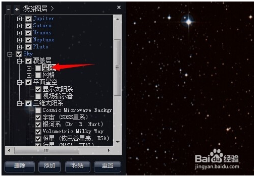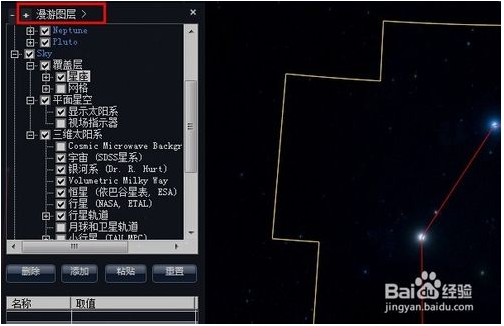 在屏幕的左側(cè),可以看到“漫游圖層”。漫游圖層就是主窗口中需要顯示的東西。比如星座的連線。