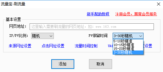 二、在出現(xiàn)的框中可以進(jìn)行設(shè)置。輸入要刷流量的網(wǎng)址,可以設(shè)置IP/PV的比例、PV停留時間等信息,設(shè)置完畢點擊【添加】。