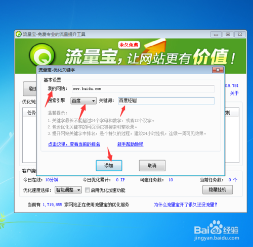 2.在打開的關(guān)鍵字排名設(shè)置窗口里,我們根據(jù)里面的需求,輸入對應(yīng)的內(nèi)容,然后點擊“添加” 如圖