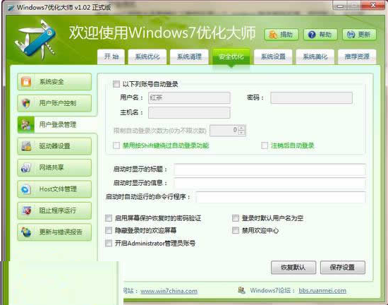 雖說win7的安全系數(shù)相比之前的任何一個Windows版本都來的高,但實際上,如何更好的優(yōu)化自己的安全防護措施也是一個必要的課題,好在Windows7優(yōu)化大師有相當全面的安全優(yōu)化方案供用戶選擇使用這其中包括了“用戶賬戶控制、用戶登錄管理、網(wǎng)絡共享、host文件管理”等多種功能項