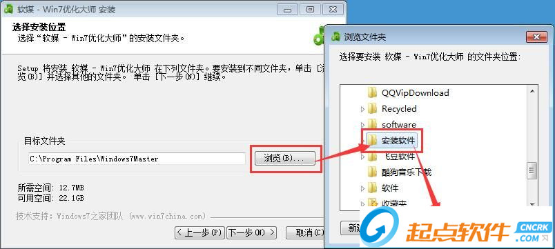 這一步我們需要確定Windows7優(yōu)化大師的安裝路徑,安裝程序有默認的安裝路徑:C:\Program Files\Windows7Master。安裝Windows7優(yōu)化大師至少需要12.7MB的磁盤空間。需要修改路徑的朋友可以點擊瀏覽,選擇需要安裝的文件夾后,點擊確定就可以修改安裝路徑了。點擊下一步繼續(xù)安裝進程;