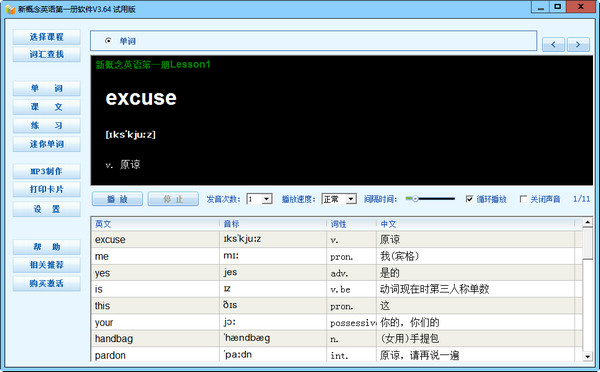 1.本軟件采用“真人發(fā)聲”避免發(fā)聲引擎的模糊不清。2.本軟件與《新概念英語(yǔ)第一冊(cè)》教材同步。