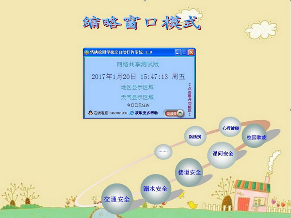 自動(dòng)打鈴系統(tǒng)是一款功能強(qiáng)大的智能定時(shí)打鈴軟件。這款軟件除了具有基本的打鈴功能,還可以為用戶提供大量有關(guān)安全教育的順口溜,簡(jiǎn)單易學(xué),在播放廣播的同時(shí),對(duì)同學(xué)們進(jìn)行潛移默化的安全教育。