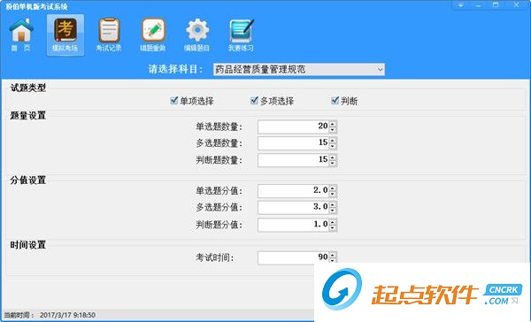1、模擬考場用戶可設(shè)置考試類型,各類型題目的數(shù)量,一級各題型的分值,還有考試時間。